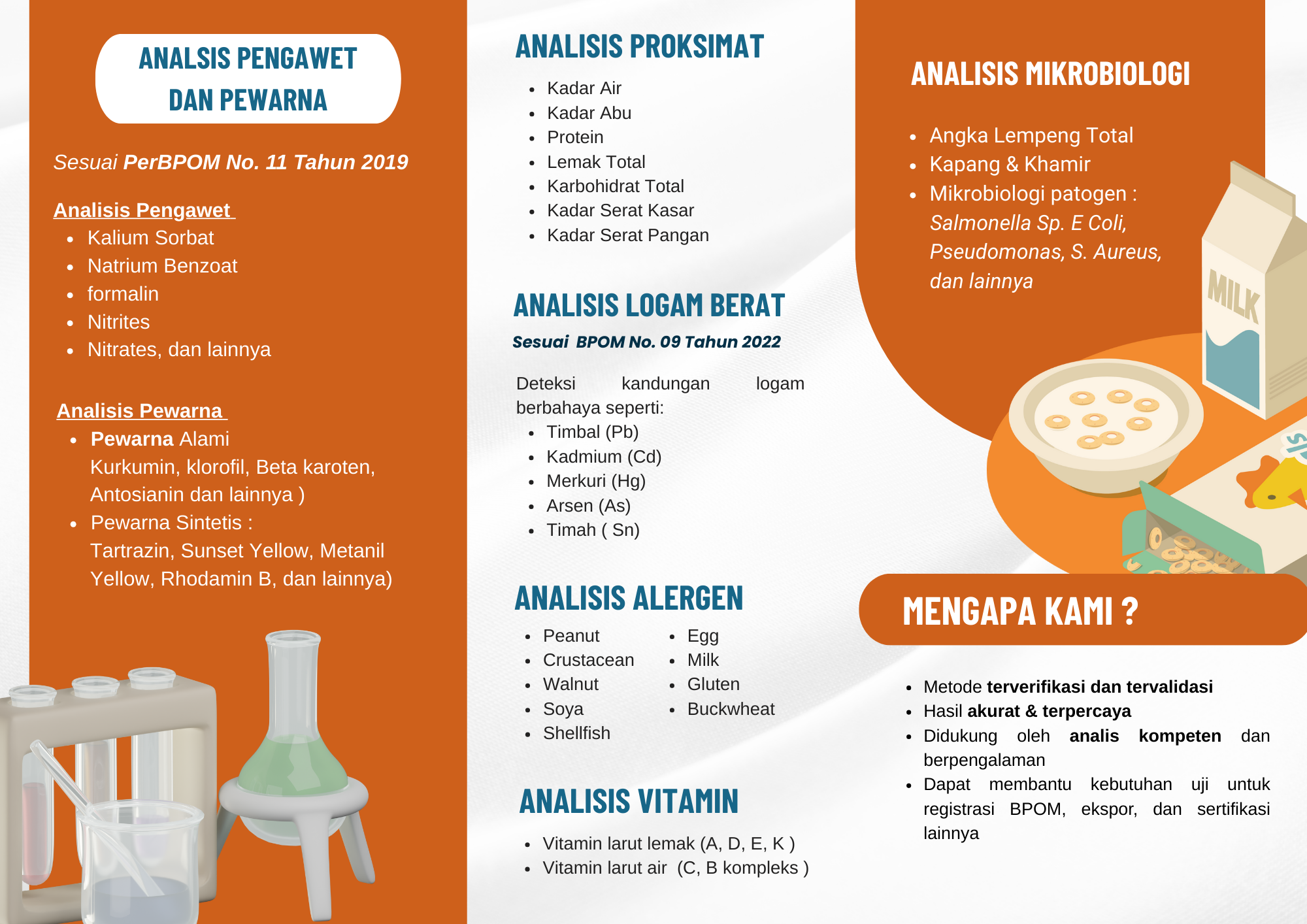 • Menyediakan protokol pengujian sesuai regulasi tentang batas cemaran mikroba, bahan tambahan pangan (seperti pewarna dan pengawet), dan parameter keamanan lainnya